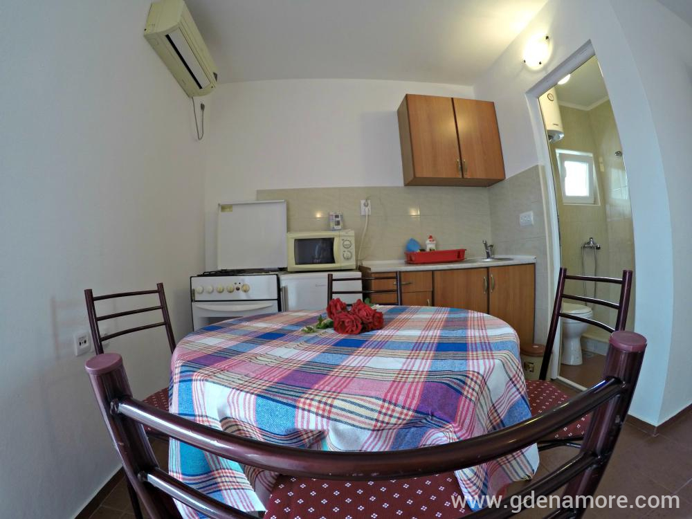 Két apartman mindennel felszerelt, ami egy kellemes nyaraláshoz szükséges. Külön fürdőszoba, külön tengerre néző terasz, konyha edényekkel, légkondicionált apartmanok wifivel.